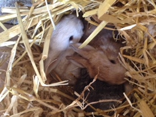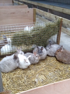 The runs are simple wire mesh pens, with boarded bottoms to reduce the effect of draughts and concrete floors bedded with straw. Does live in family colonies whilst bucks have individual pens with lids. The pens are easy to clean out and I find that as long as they are kept clean and dry, the bunnies need very little grooming.