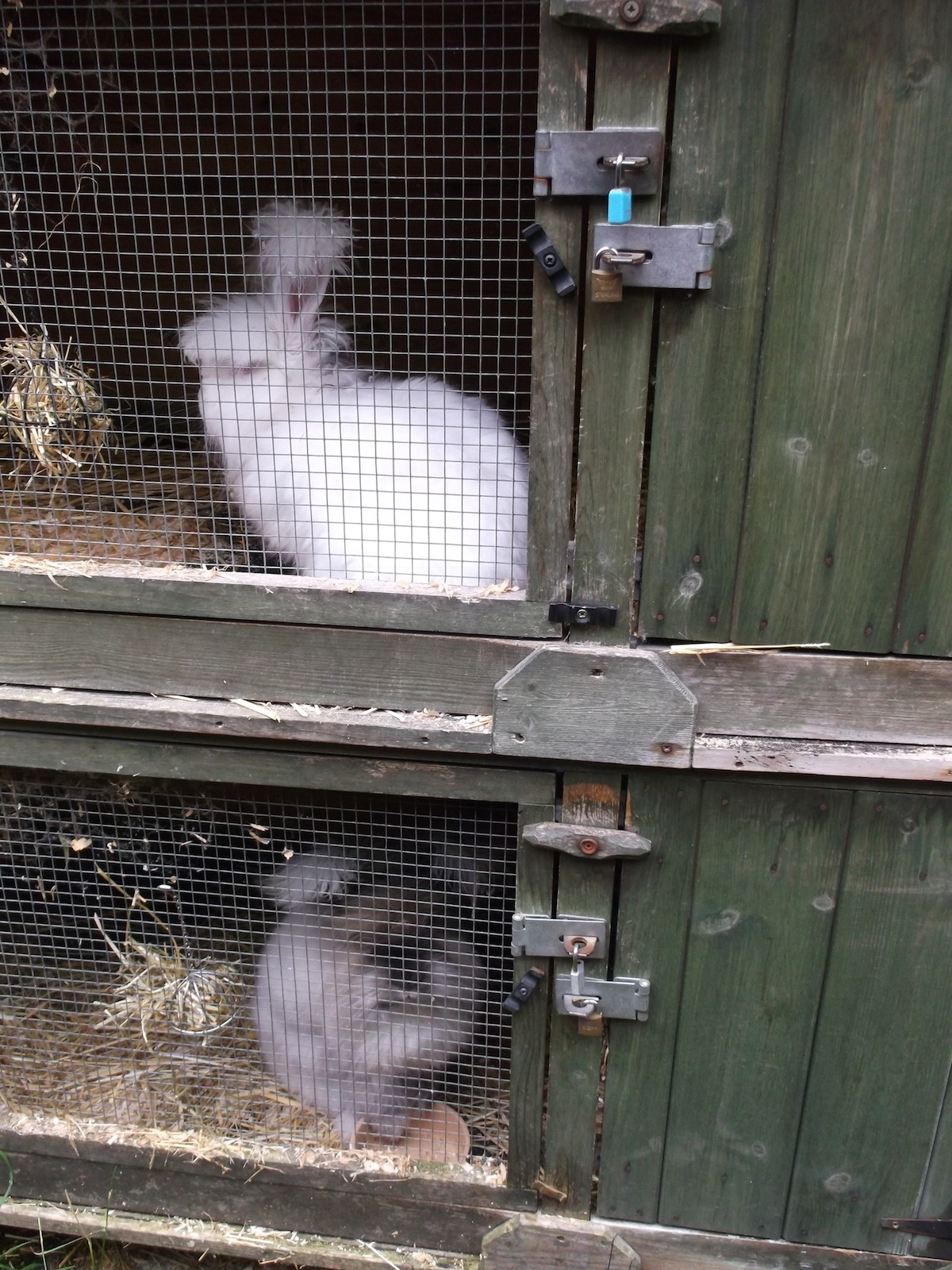 Show angoras will need to be put on wire from eight weeks to the end of their show life, which as at the most 8 months old. This is because they should have very thick and long feet furnishings. If they are kept on straw and woodchip etc, it will get into these and their coats and they will not make the show bench. As soon as they are clipped, they can be treated normally, and bedded on shavings and barley straw.