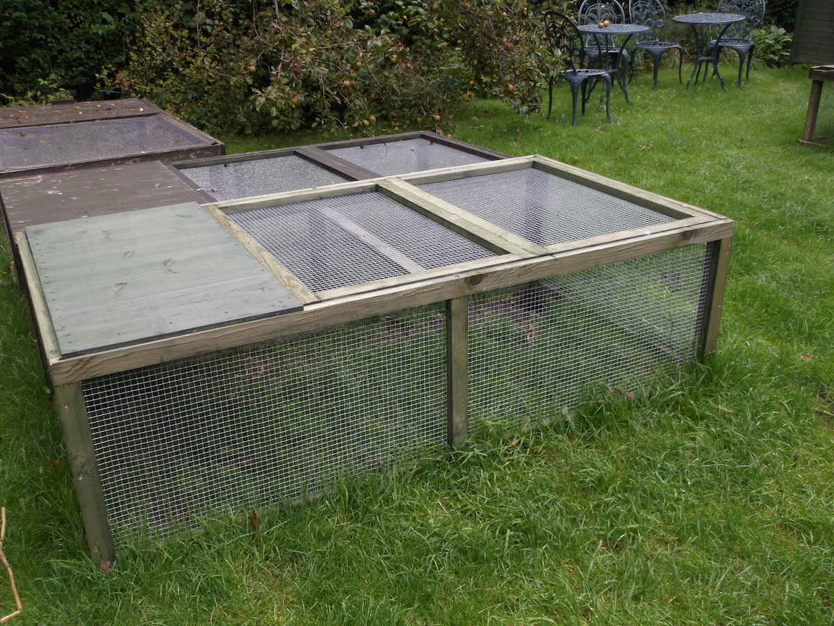 Not all need to have breeding compartments, but litter boards are essential, so bedding does not drop out when the door is opened. Weld mesh is best for the doors as chicken wire is not fox/dog/badger proof. The mesh must be small enough to exclude rats and mice. An internal partition may rub the rabbit’s wool as it passes through, and is not essential, even for outdoor rabbit hutches. The rabbit also has more room to hop. However, shutters are advised for the weldmesh front of an outdoor hutch for bad weather. A shutter covering 3/4 of the front leaves a space for vision and for ventilation.
