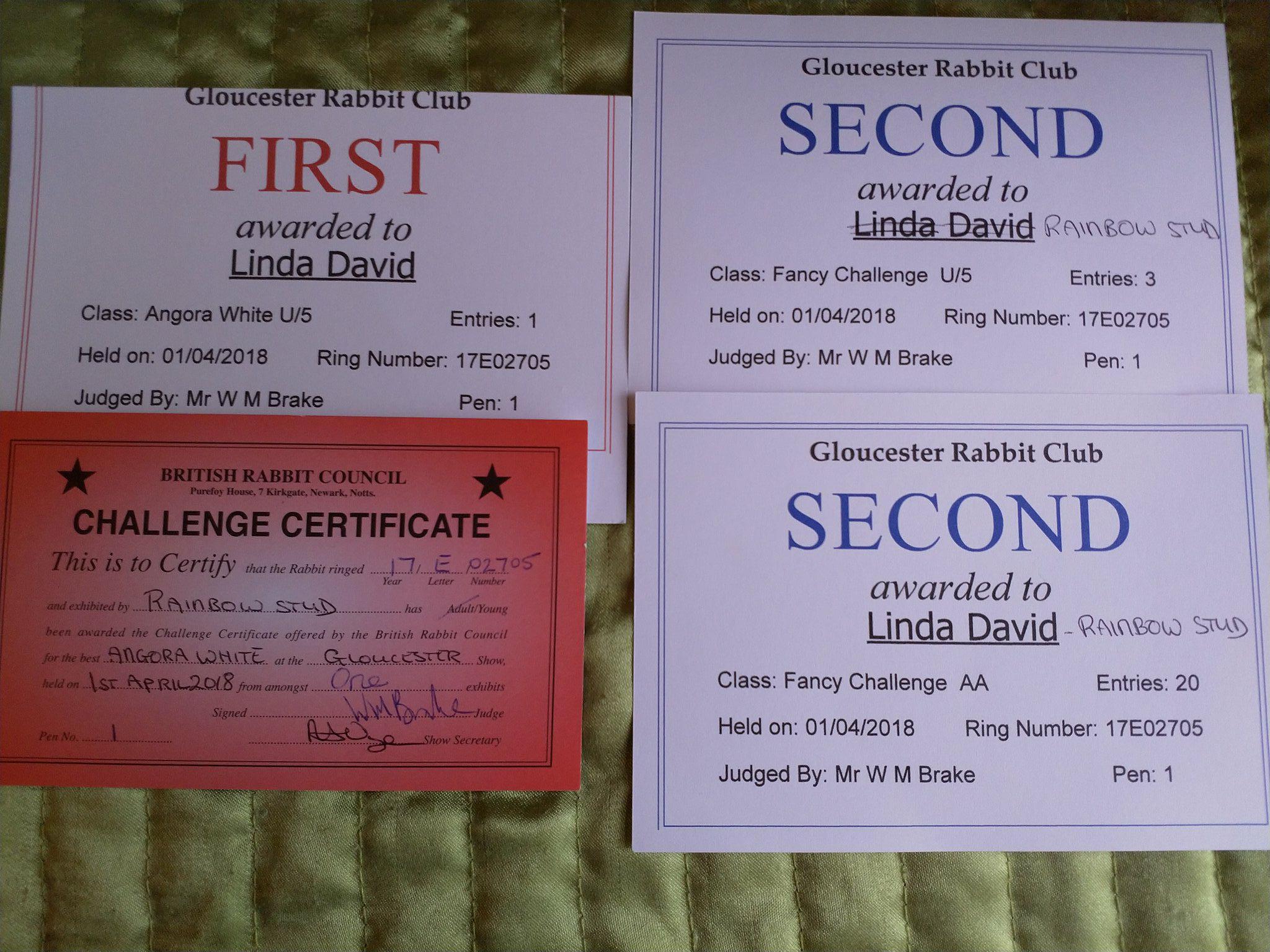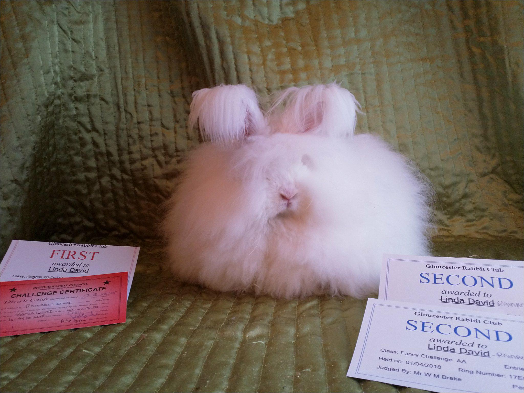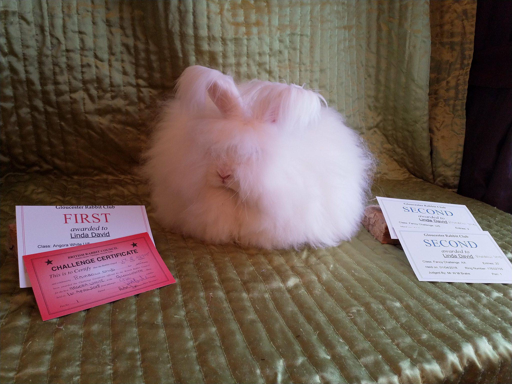 This is Guinevere, an English Angora rabbit and todays winner of the angora class at the Gloucester show. She belongs to Linda David of Rainbow Stud. Guinevere got her Challenge Certificate (CC) and was second in the under five (u/5) challenge and 2nd in the grand challenge out of 20 rabbits. She was bred by Yvonne Hobbs-Fothergill of Willowcot Stud. The judging at the show was done by Bill brake. Congratulations, Linda that is a superb result.