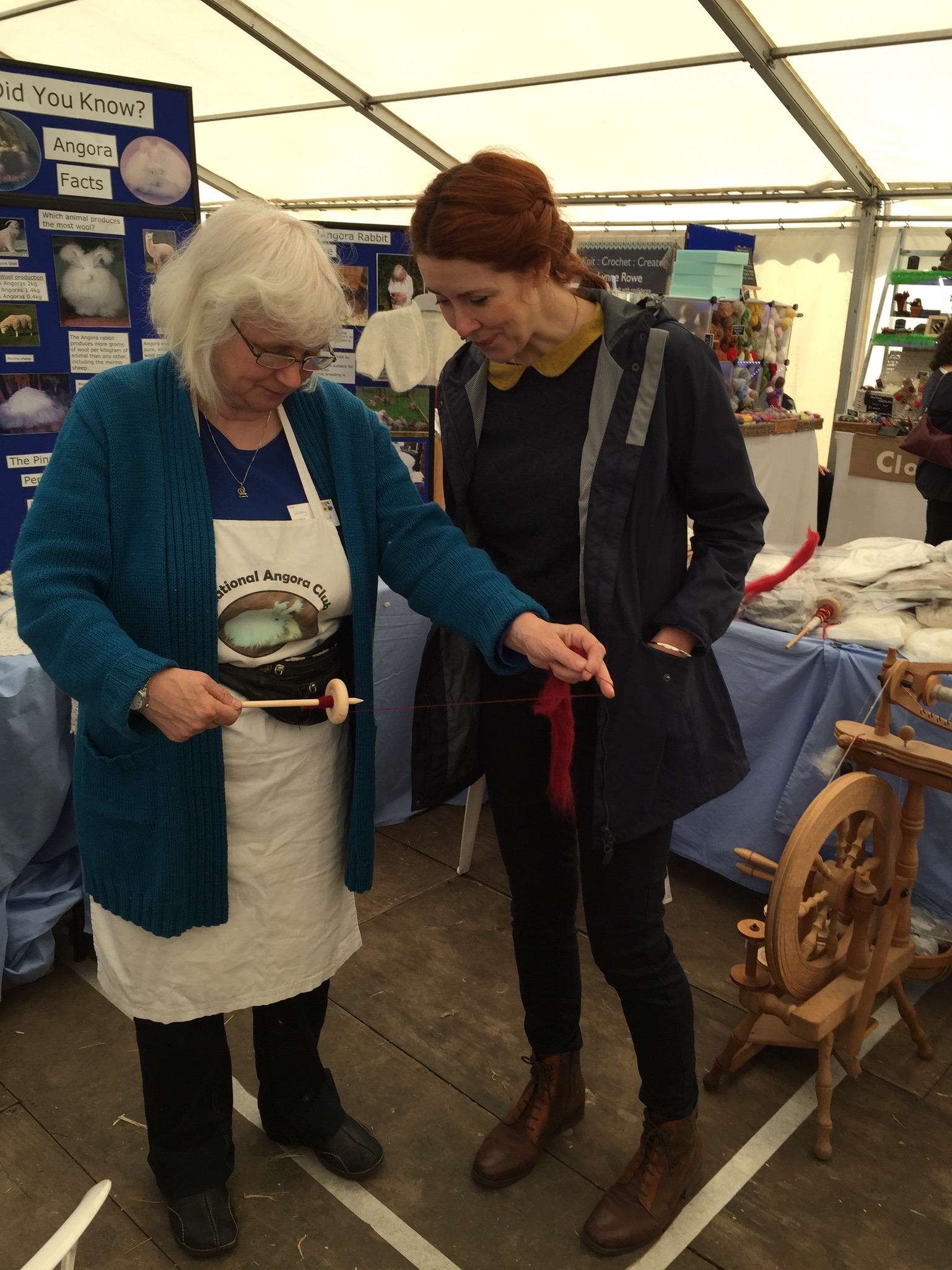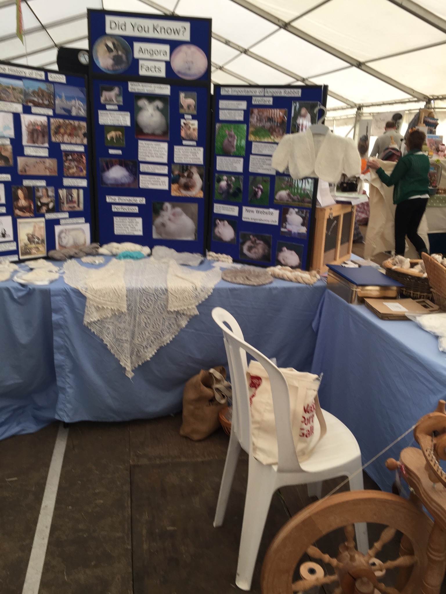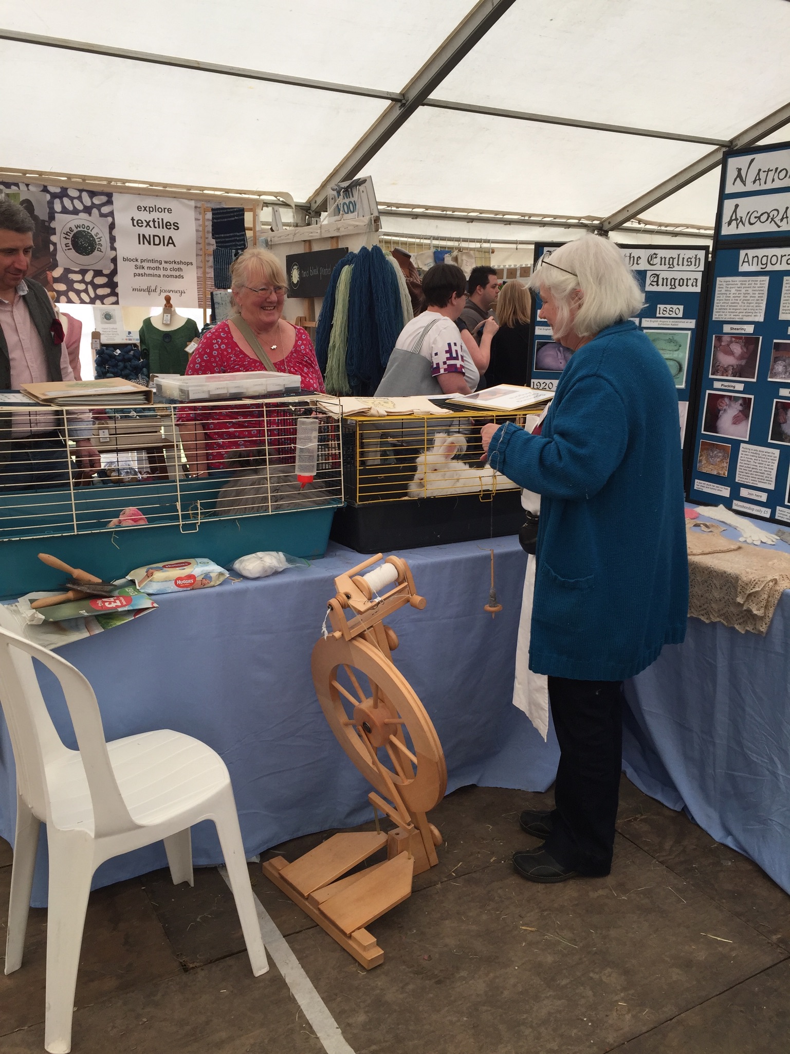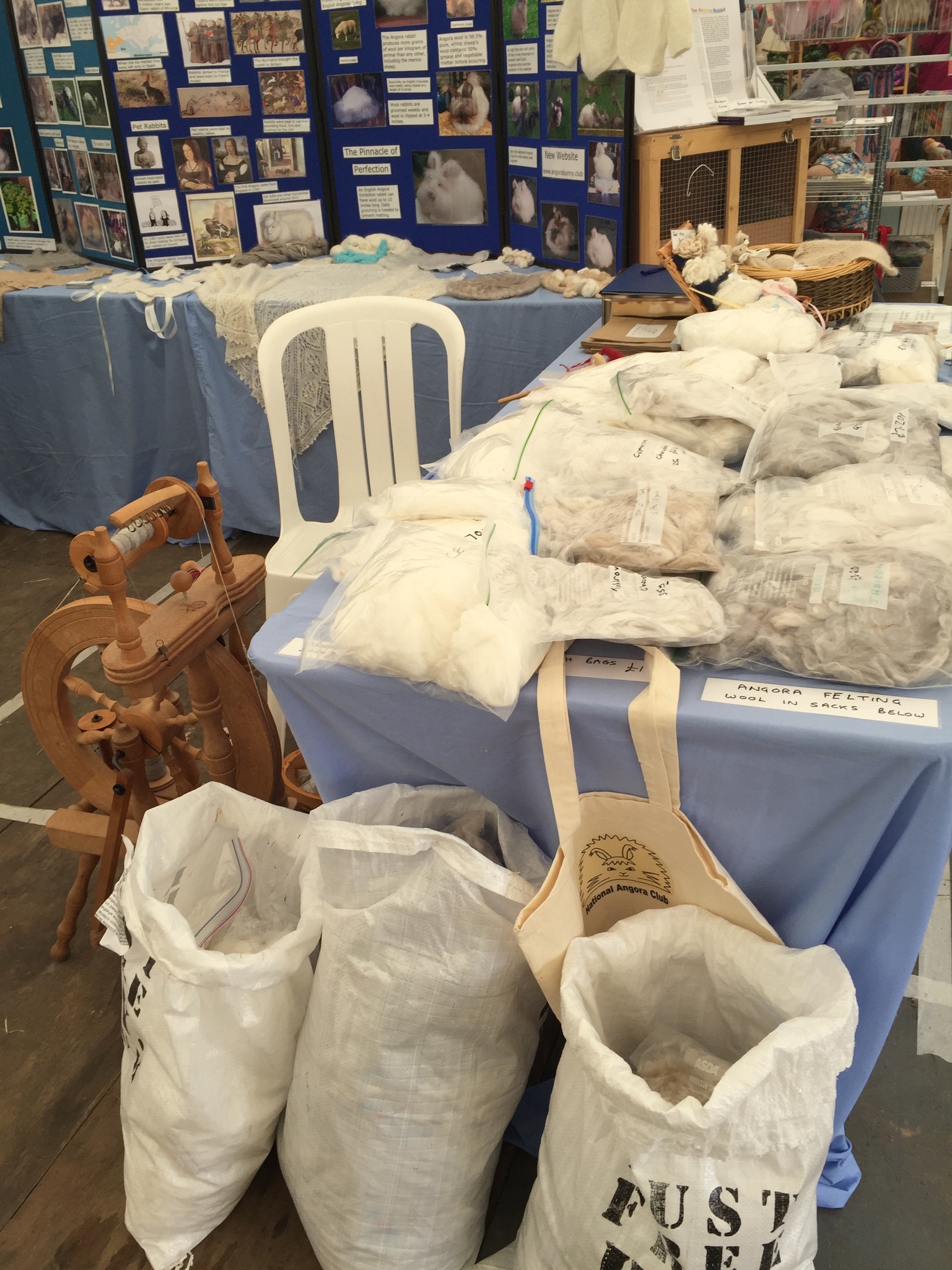 Wool@j13 is a relatively new craft festival, held at Lower Drayton Farm, Penkridge, right next to the M6 motorway, Junction 13! This was the second year that the National Angora Club had been invited to take part. Sally May and Lesley Hordon took the Club’s wool for sale, and Sally demonstrated clipping Bunny and Elijah for an admiring audience, whilst Lesley gave a talk on the Angora Rabbit. As usual, drop-in spindle spinning lessons were held on the Stand and proved very popular. A great weekend was had by all. Here are a few images of the event which we thoroughly enjoyed. If you missed Wool@j13, look out for the National Angora Club Stand at 3 other Craft Festivals this summer. We will be at Woolfest in Cockermouth in June, www.woolfest.co.uk, Fibre-East in Ampthill, Bedfordshire in July, www.fibre-east.co.uk and the British Wool Show, Murton, York in August http://britishwool.net . Come and say hello!