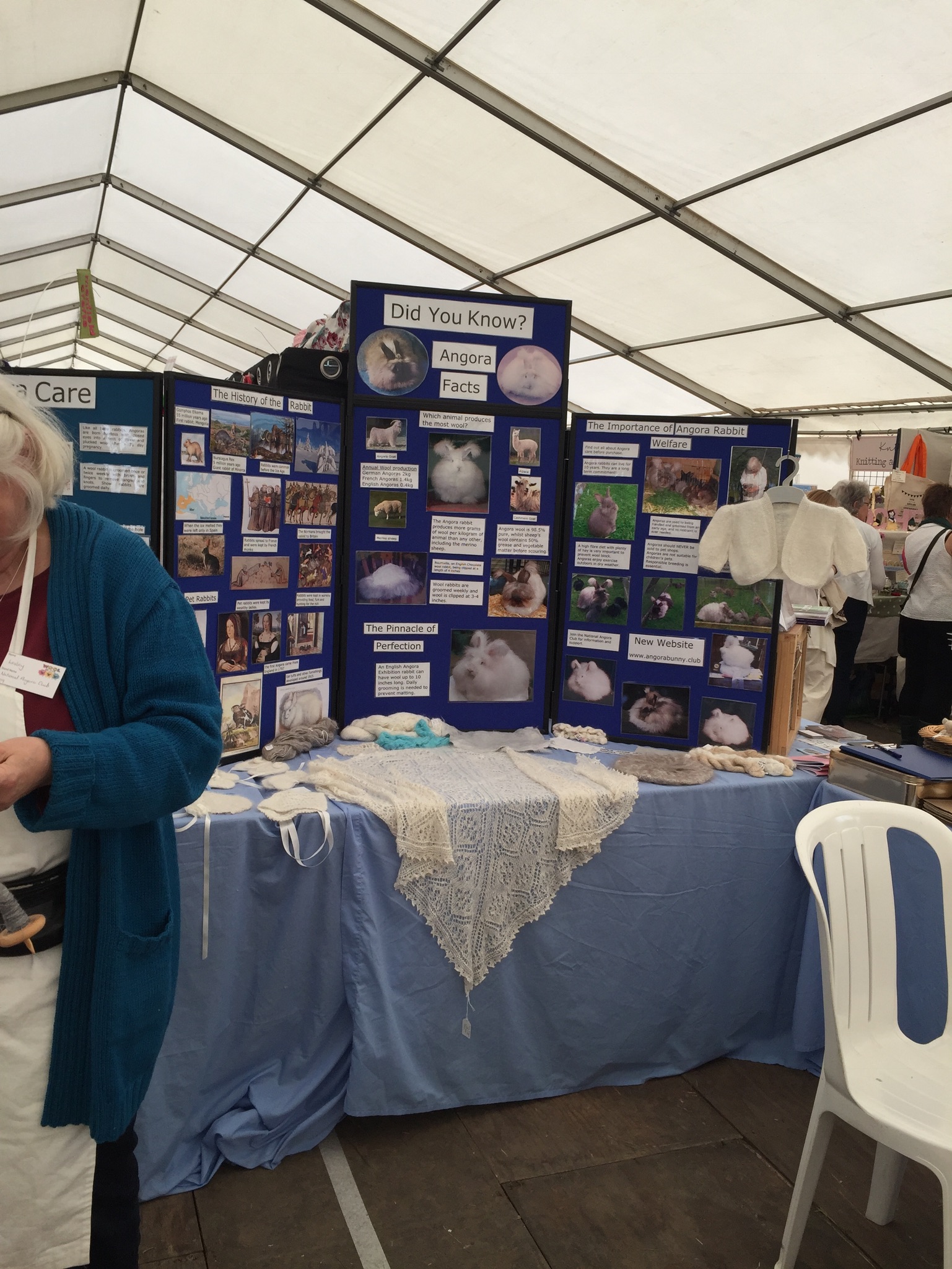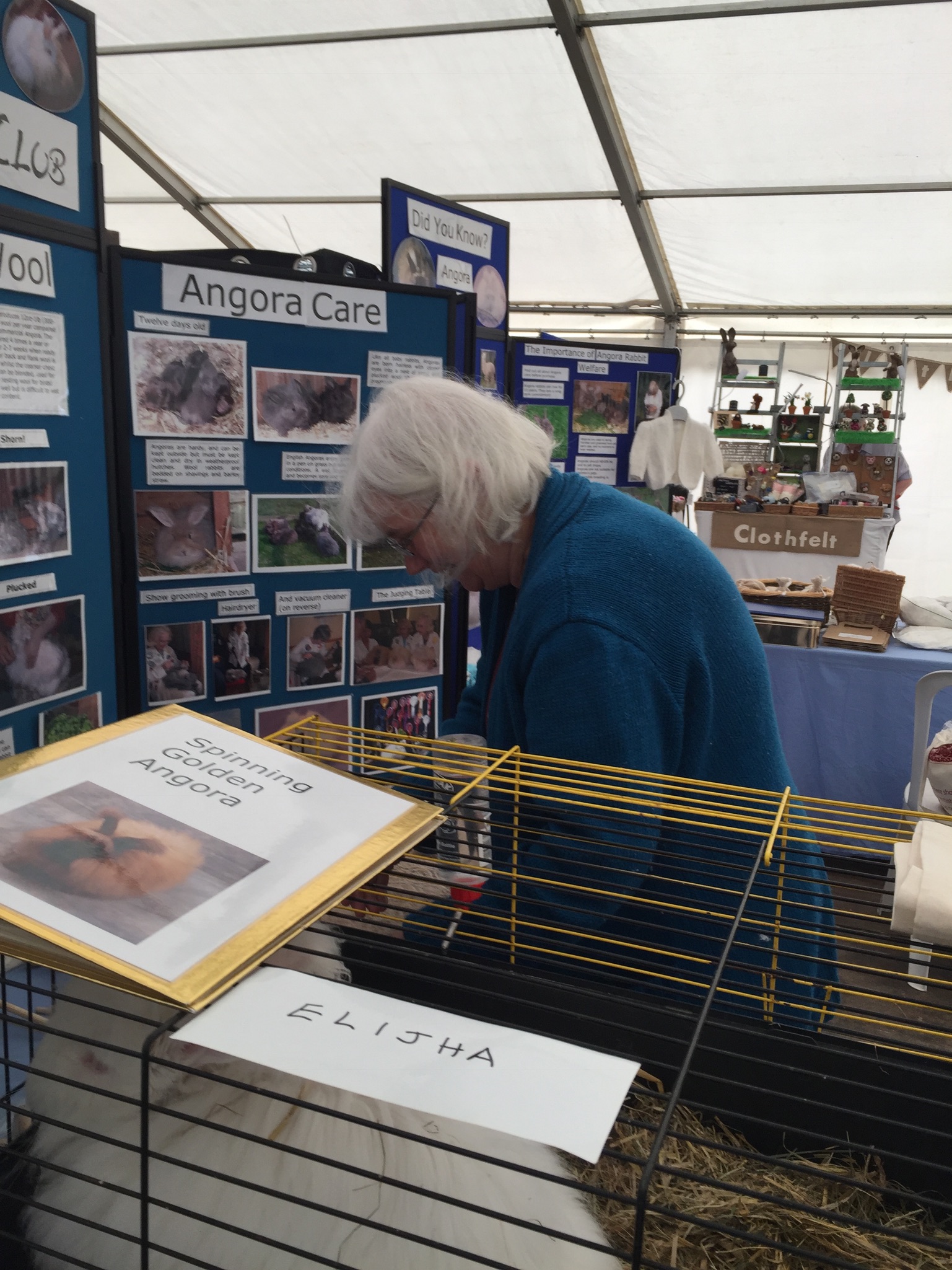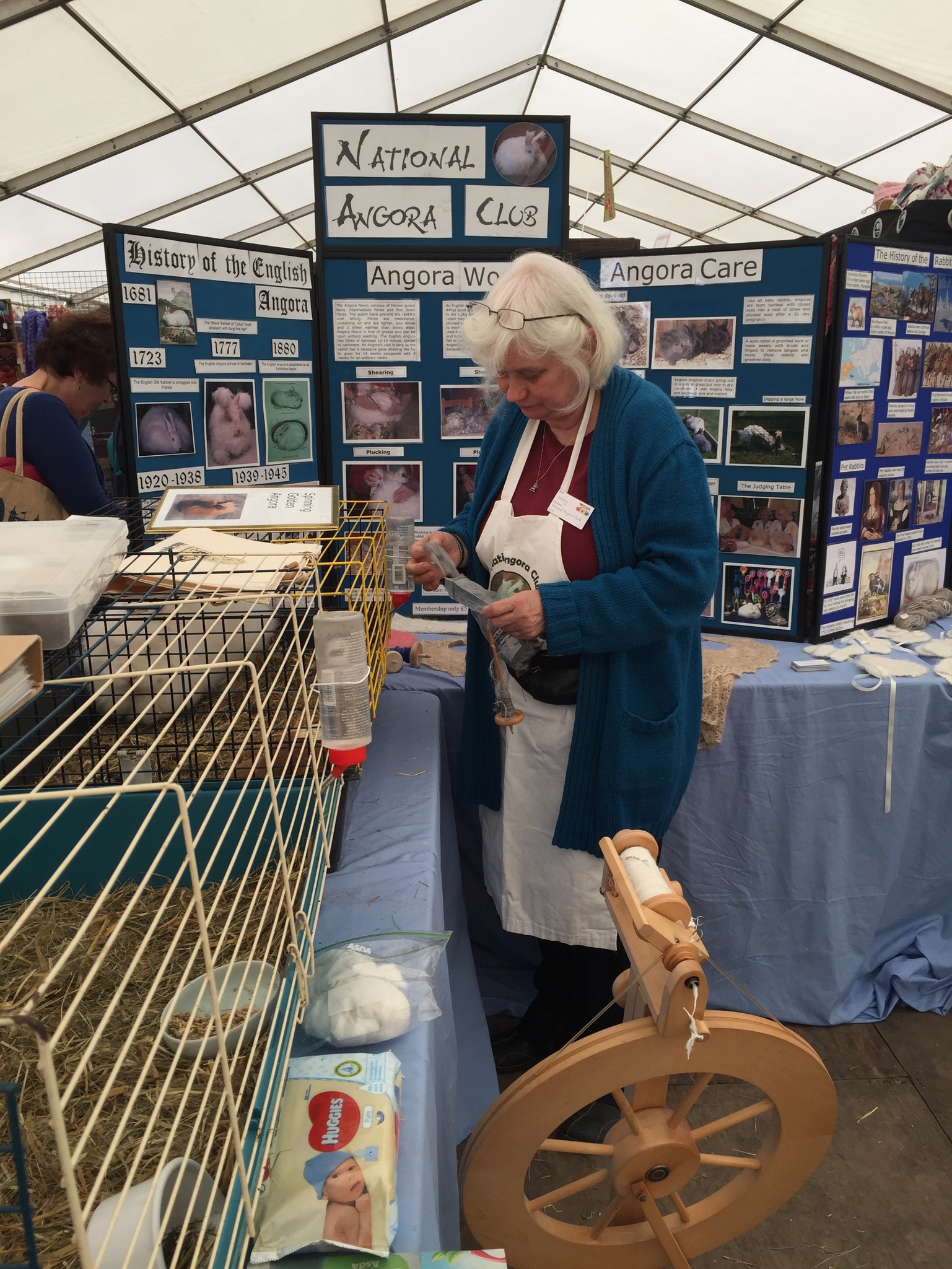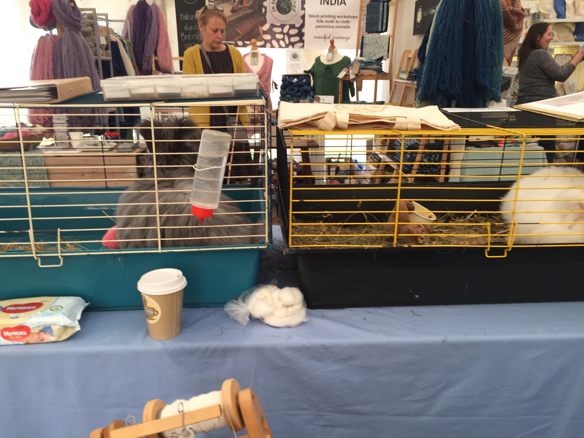 Wool@j13 is a relatively new craft festival, held at Lower Drayton Farm, Penkridge, right next to the M6 motorway, Junction 13! This was the second year that the National Angora Club had been invited to take part. Sally May and Lesley Hordon took the Club’s wool for sale, and Sally demonstrated clipping Bunny and Elijah for an admiring audience, whilst Lesley gave a talk on the Angora Rabbit. As usual, drop-in spindle spinning lessons were held on the Stand and proved very popular. A great weekend was had by all. Here are a few images of the event which we thoroughly enjoyed. If you missed Wool@j13, look out for the National Angora Club Stand at 3 other Craft Festivals this summer. We will be at Woolfest in Cockermouth in June, www.woolfest.co.uk, Fibre-East in Ampthill, Bedfordshire in July, www.fibre-east.co.uk and the British Wool Show, Murton, York in August http://britishwool.net . Come and say hello!