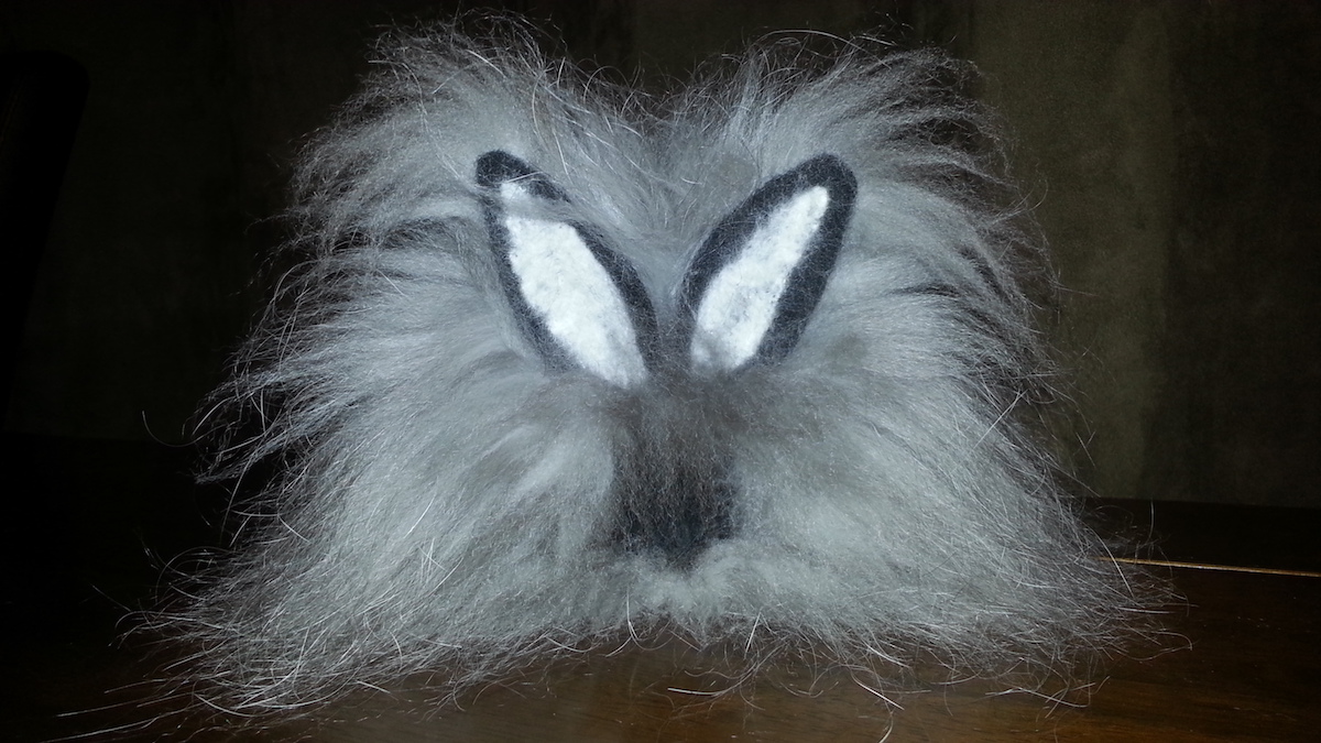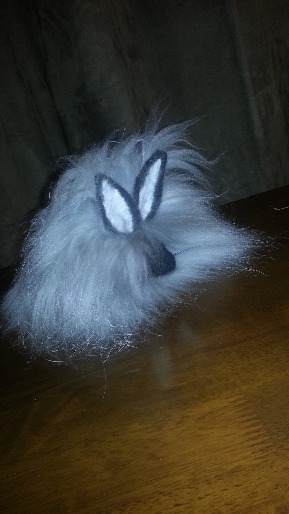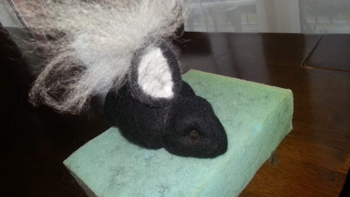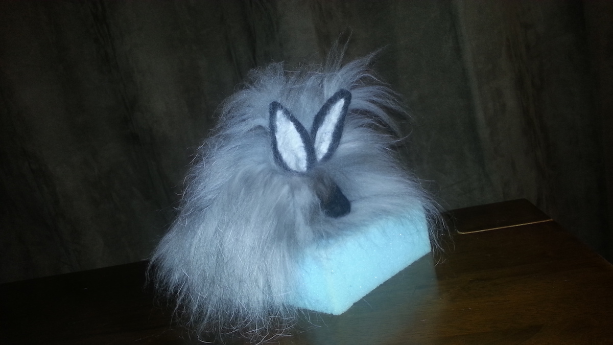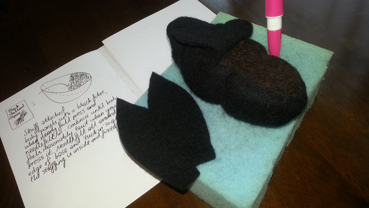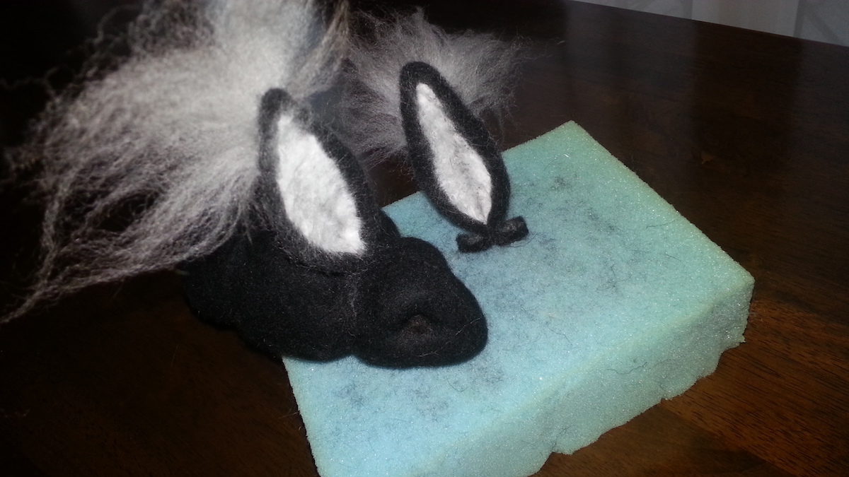 Inspired from my toy making days, I drew a pattern and cut out panels of merino pre-felt (raven is perfect for smokes). I then used a needle felt pen on the sewing line, turned the body inside out, stuffed until taut (pre-felt off cuts are ideal) and shaped. I cut out the ears and layered the tips with darker angora fibre before attaching.