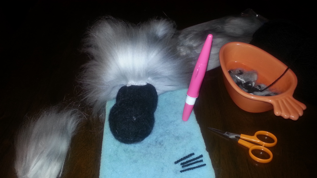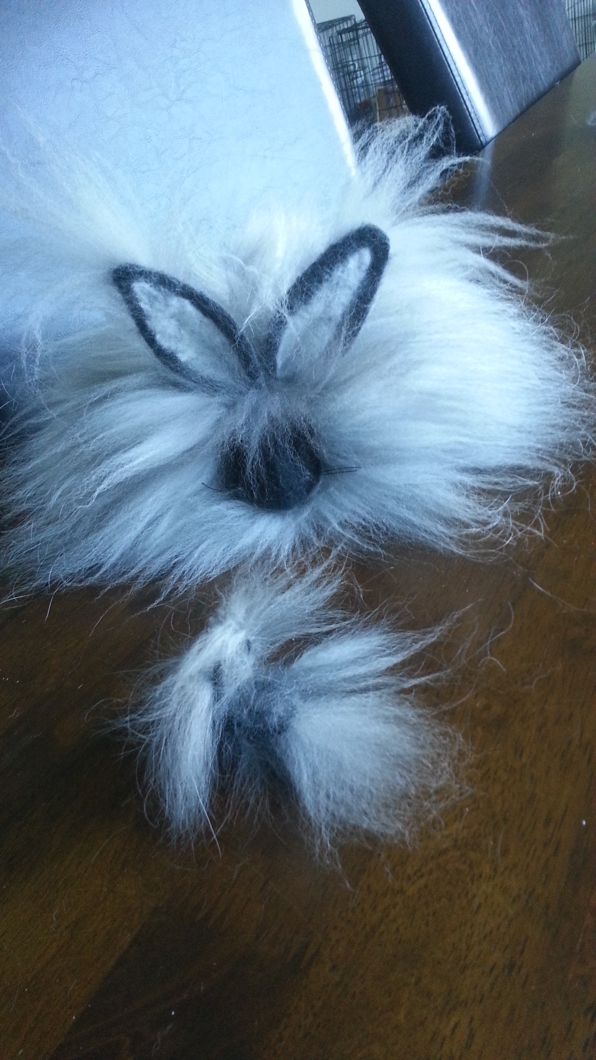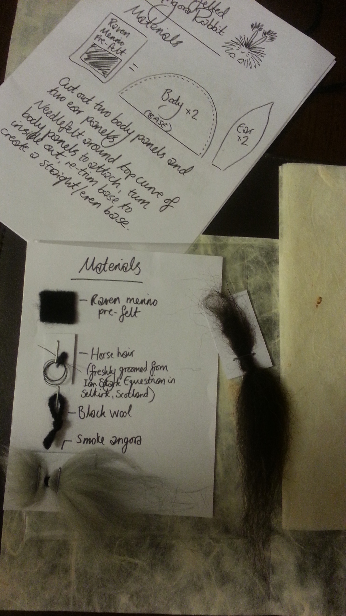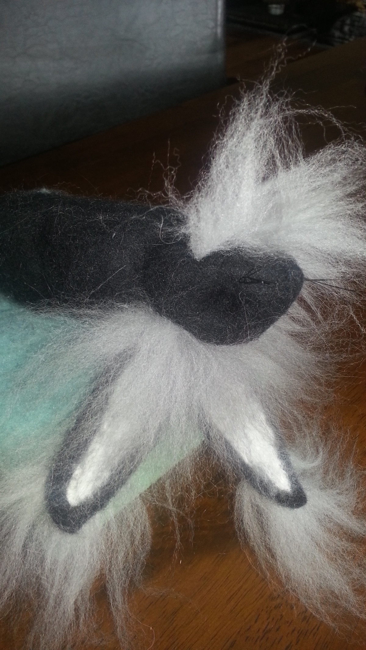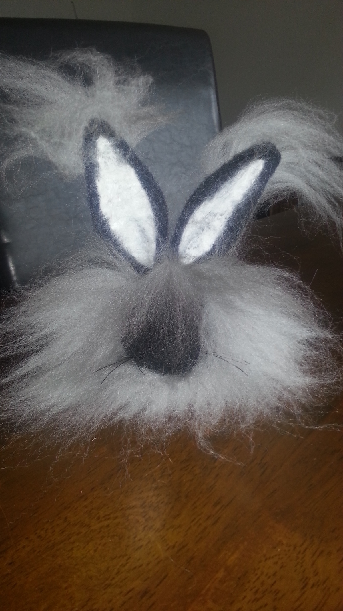 Inspired from my toy making days, I drew a pattern and cut out panels of merino pre-felt (raven is perfect for smokes). I then used a needle felt pen on the sewing line, turned the body inside out, stuffed until taut (pre-felt off cuts are ideal) and shaped. I cut out the ears and layered the tips with darker angora fibre before attaching.