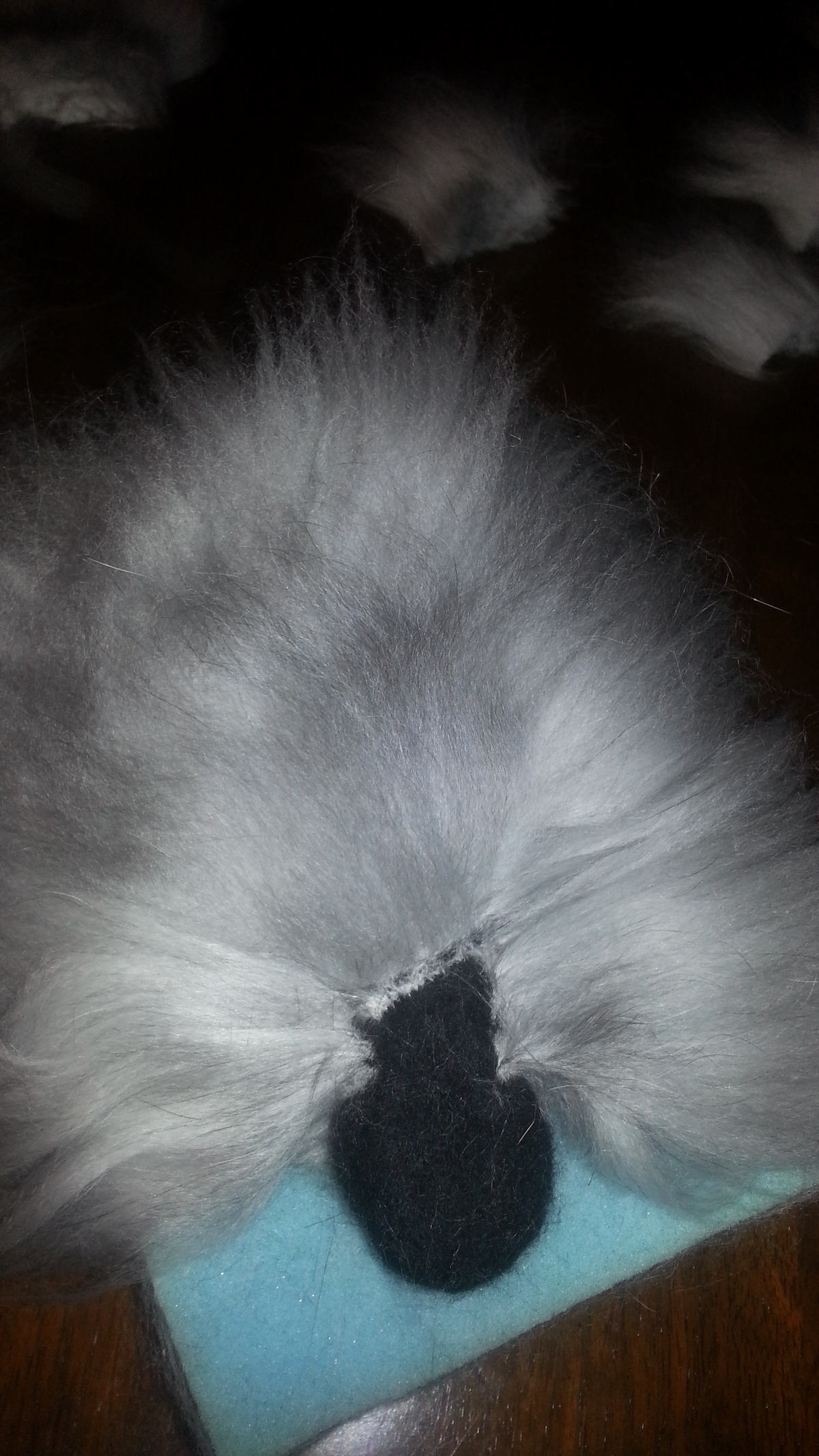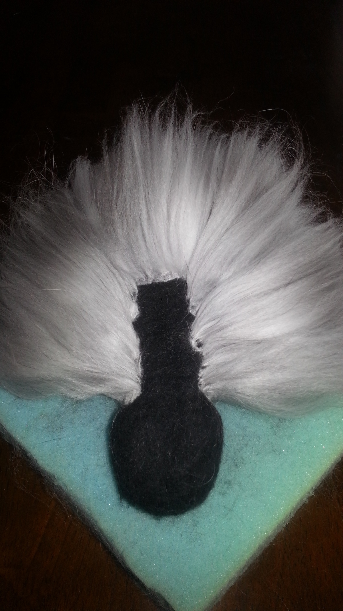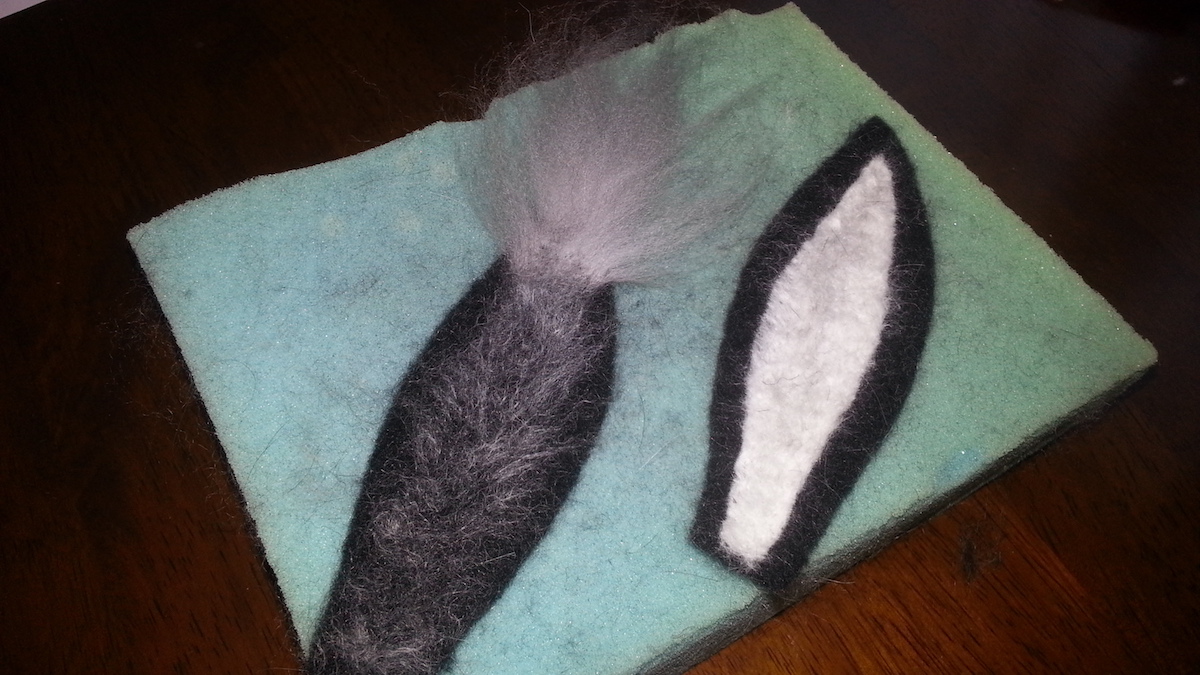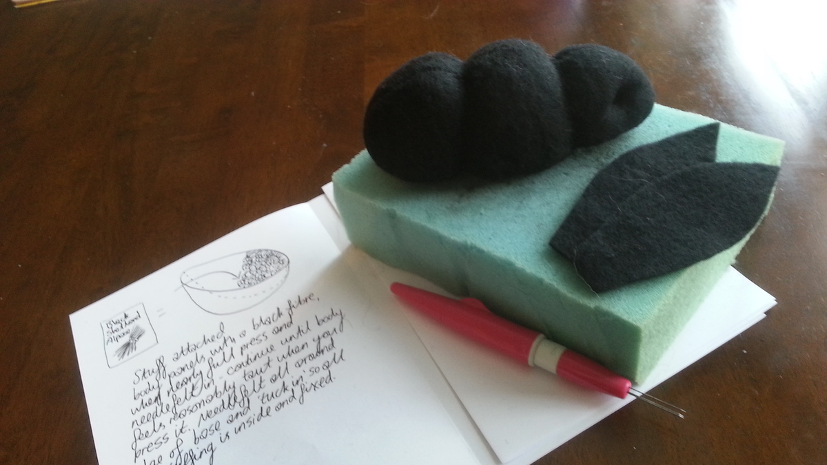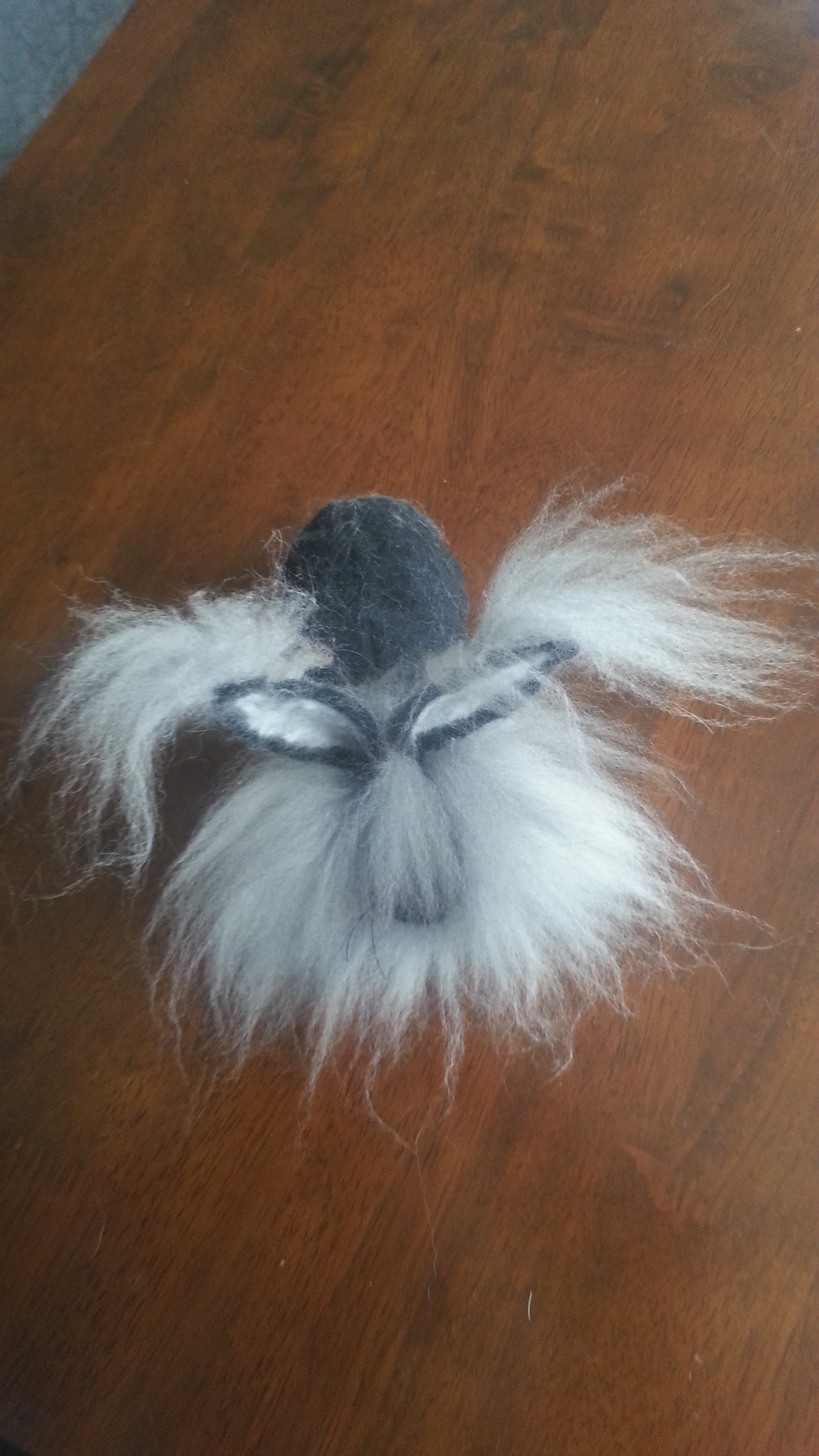 Inspired from my toy making days, I drew a pattern and cut out panels of merino pre-felt (raven is perfect for smokes). I then used a needle felt pen on the sewing line, turned the body inside out, stuffed until taut (pre-felt off cuts are ideal) and shaped. I cut out the ears and layered the tips with darker angora fibre before attaching.