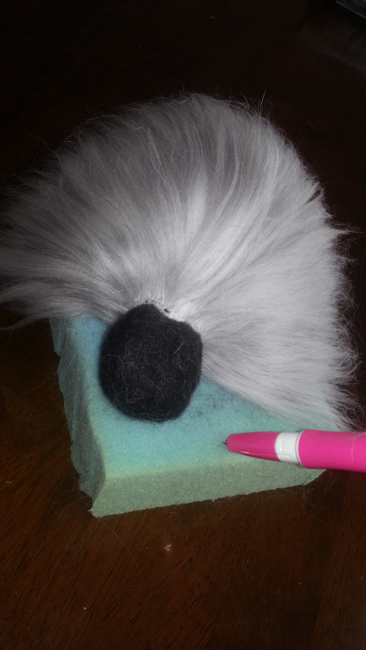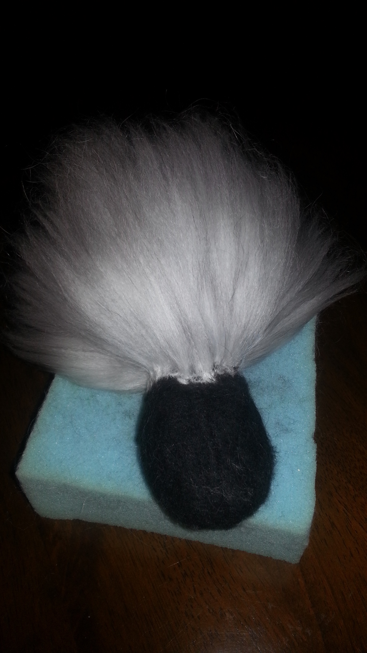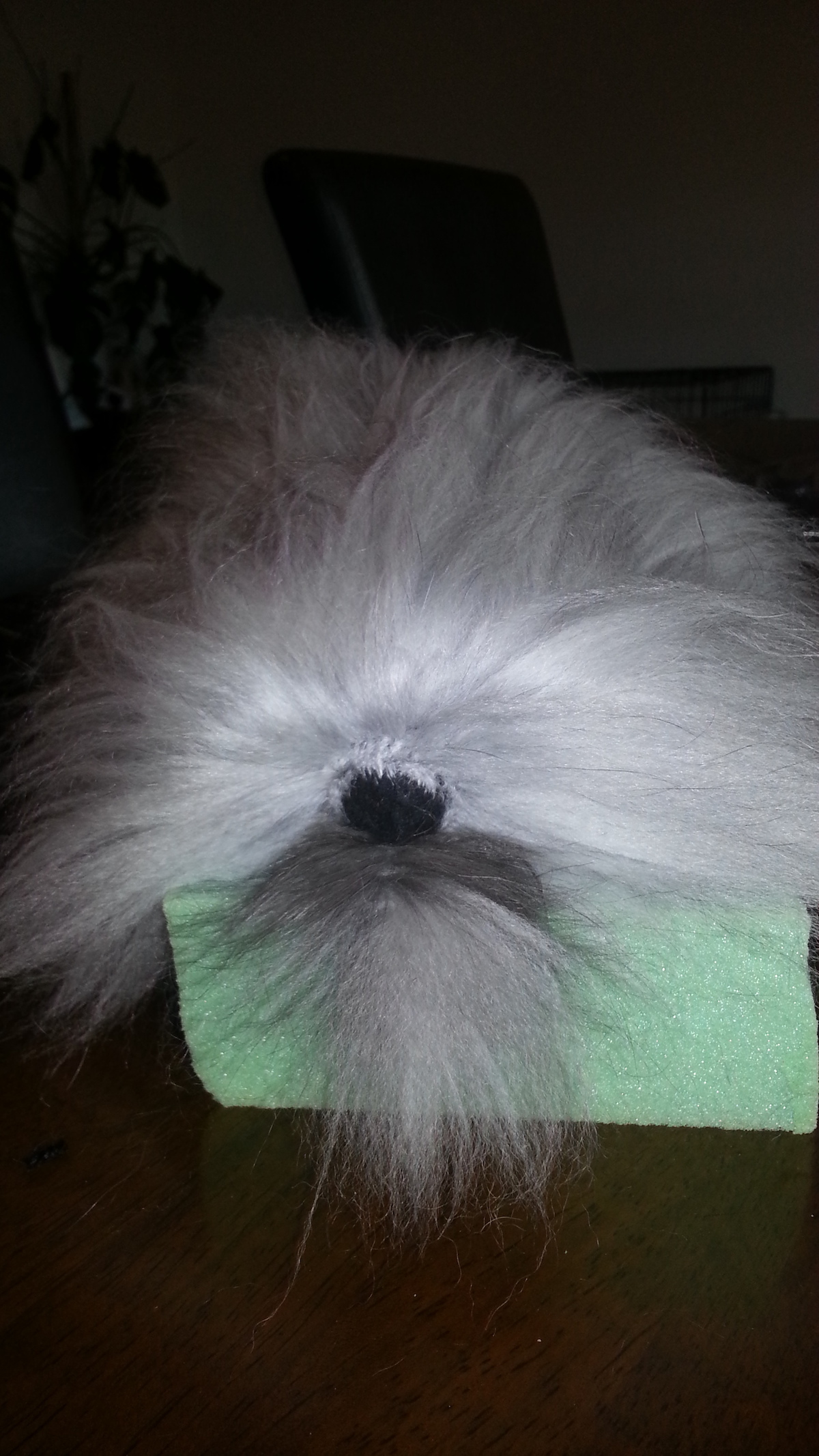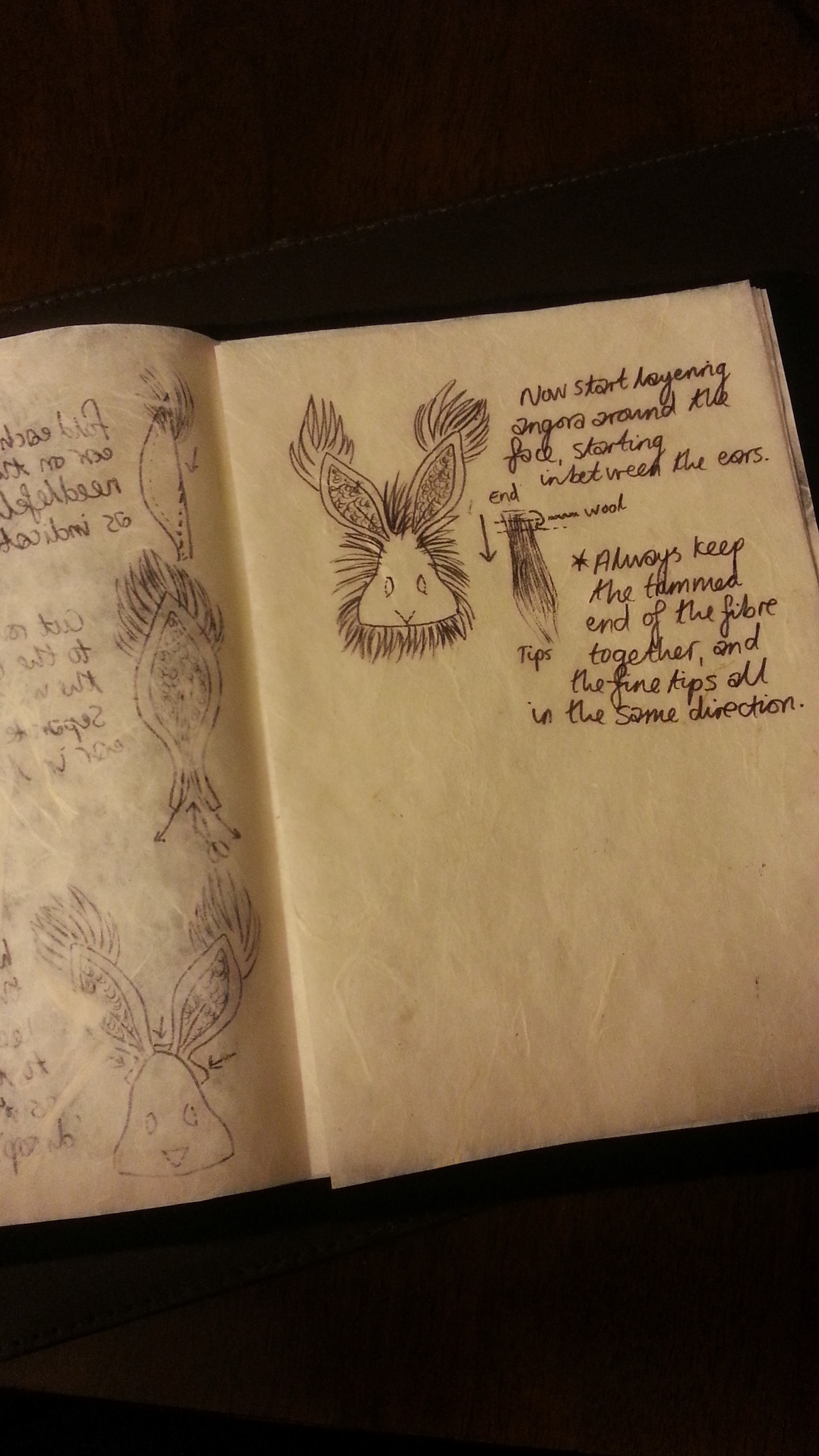 Inspired from my toy making days, I drew a pattern and cut out panels of merino pre-felt (raven is perfect for smokes). I then used a needle felt pen on the sewing line, turned the body inside out, stuffed until taut (pre-felt off cuts are ideal) and shaped. I cut out the ears and layered the tips with darker angora fibre before attaching.