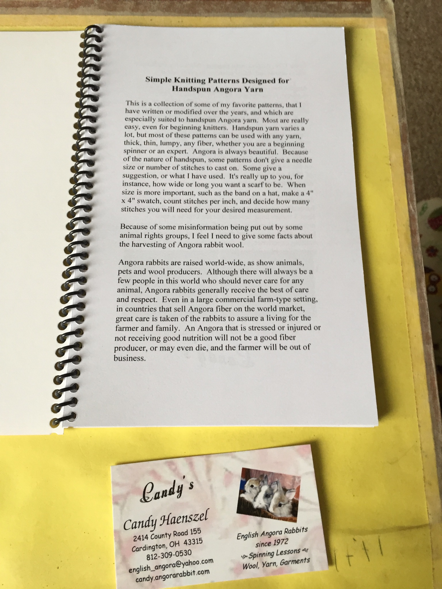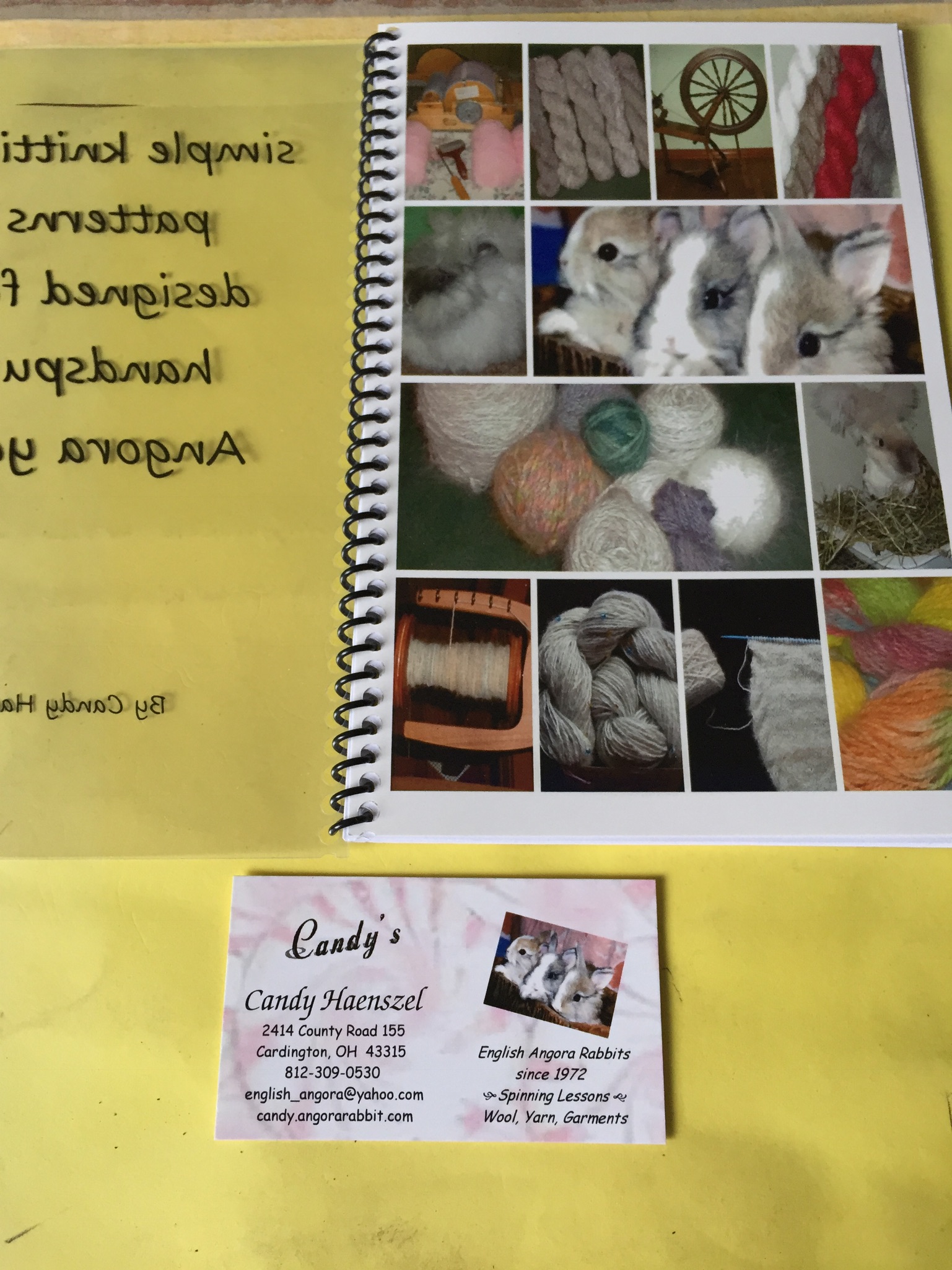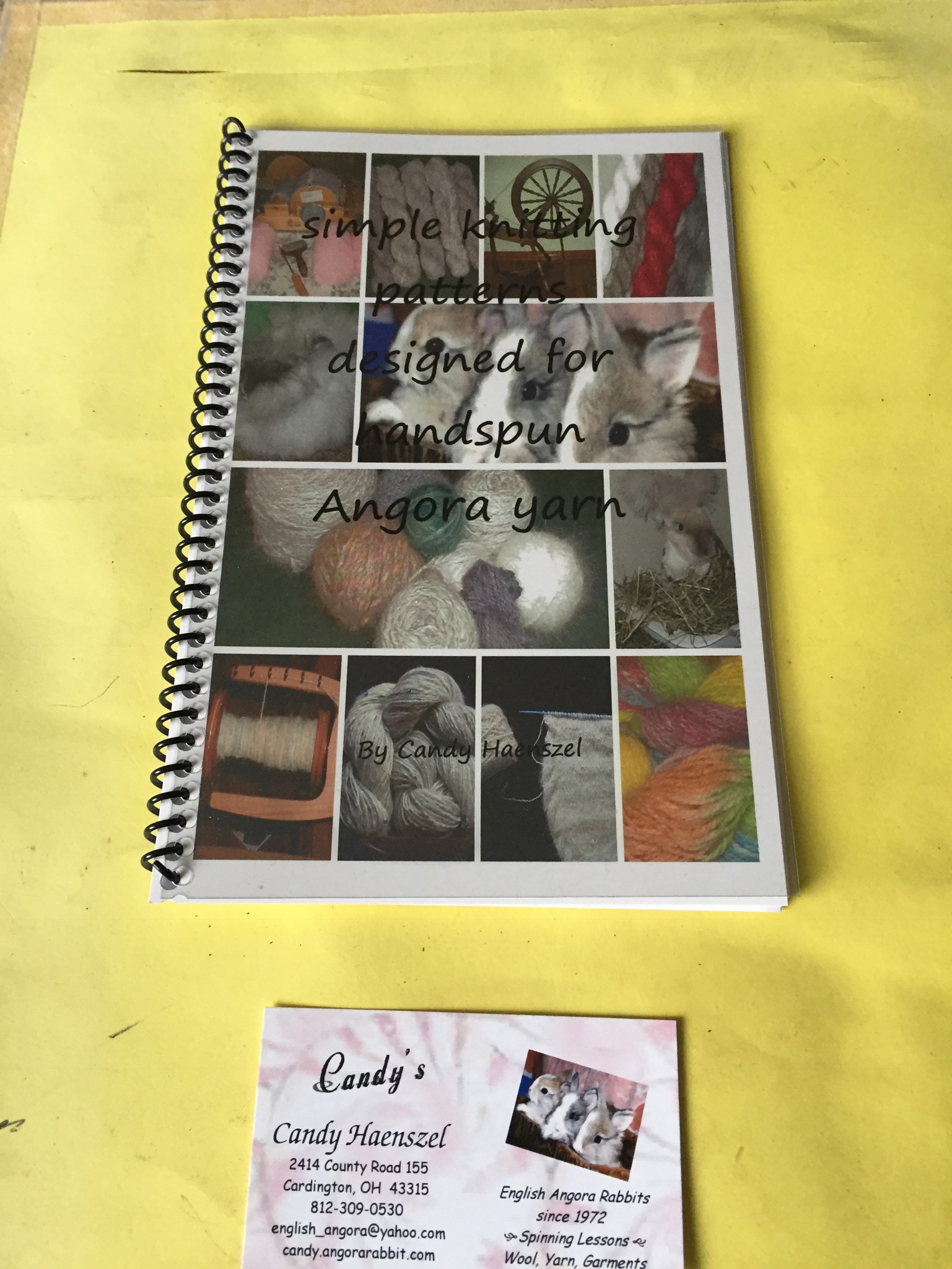 Small Knitting pattern book by Candy Haenszel a lady from The USA who has been breeding, showing and spinning angora for many years,  she has decided to put on to paper some of the patterns she designed specifically for angora wool.  It is a very helpful  little book and will help you get started in creating garments etc in angora wool. The National Angora Club hold a few Copies at £10 plus  £2 postage. Please use use the contact email on the website if you would like one.